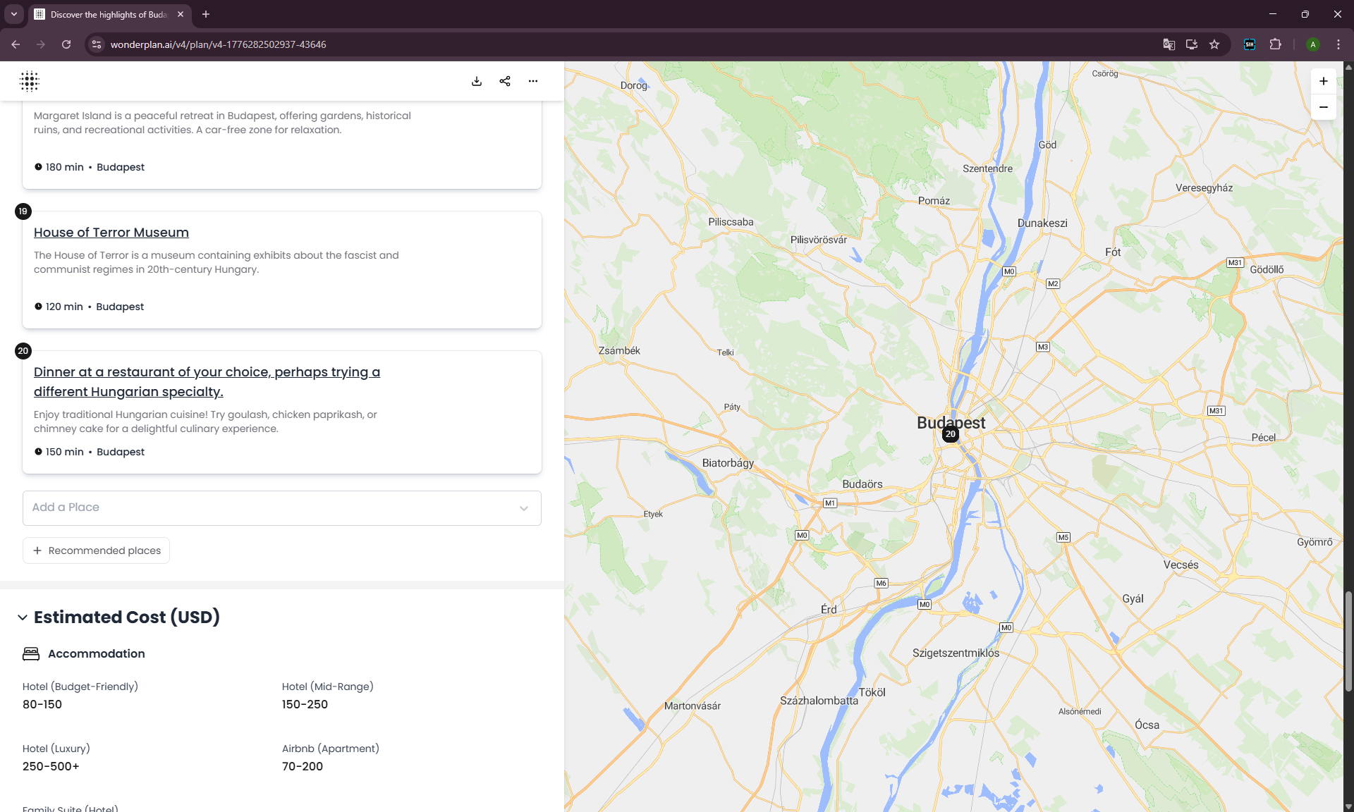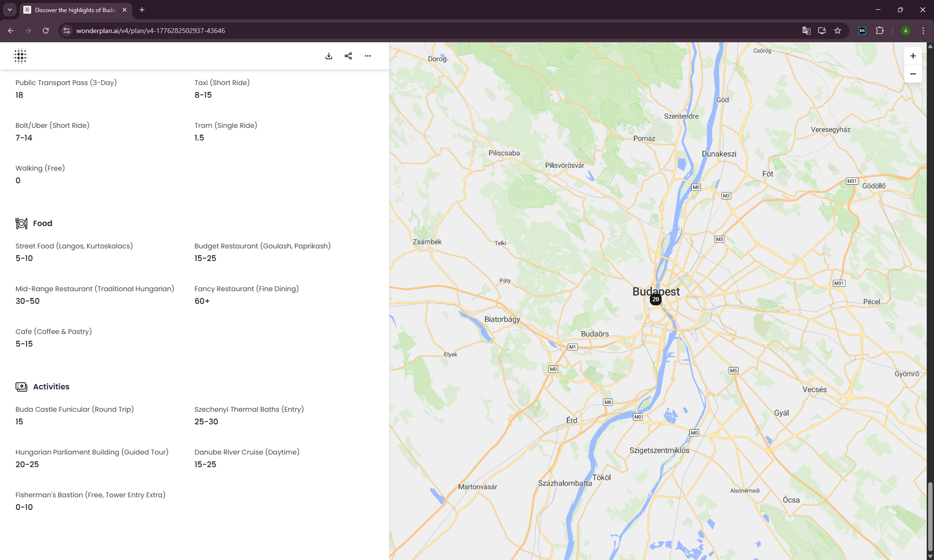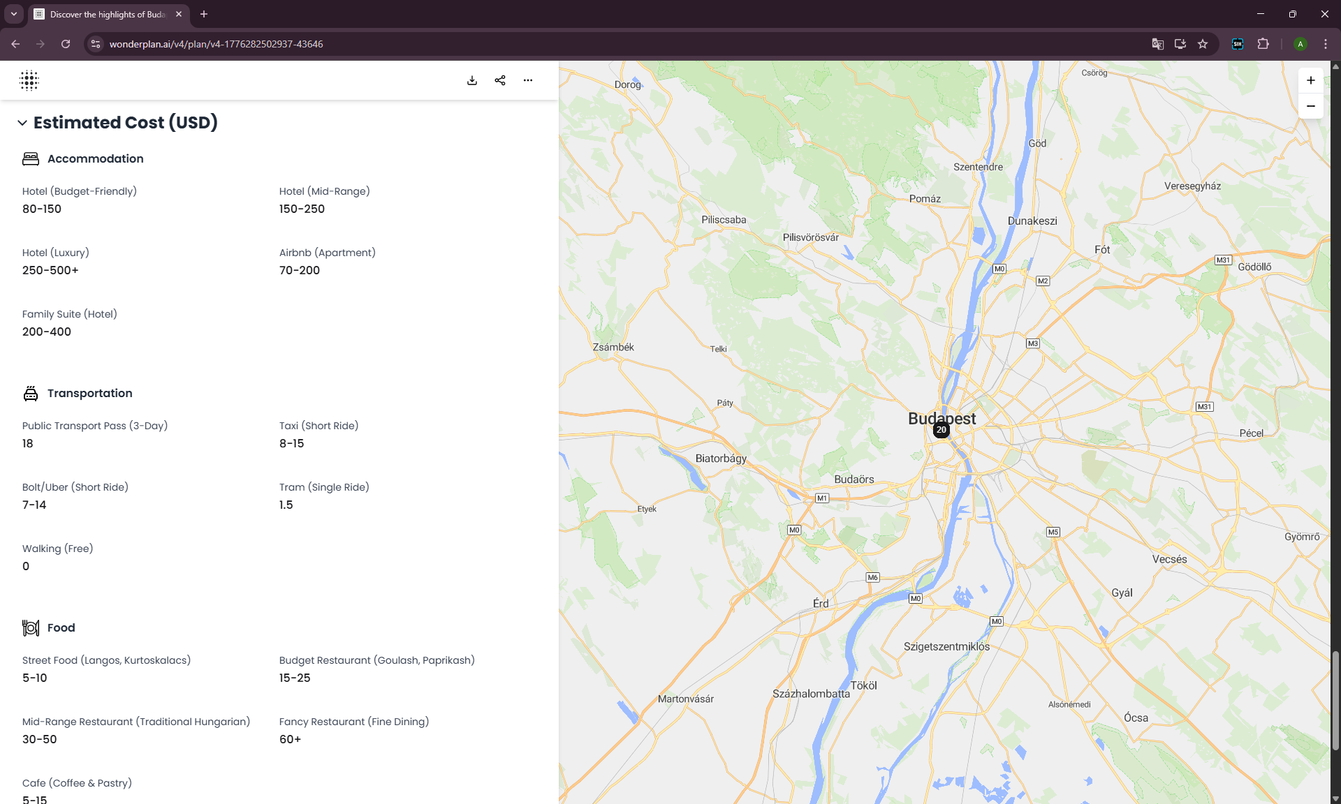 There’s a price breakdown block, but it’s just generic Budapest ranges: hotel $80–500, food $5–60+, activities $15–30. Not tied to the actual itinerary, no total calculated.