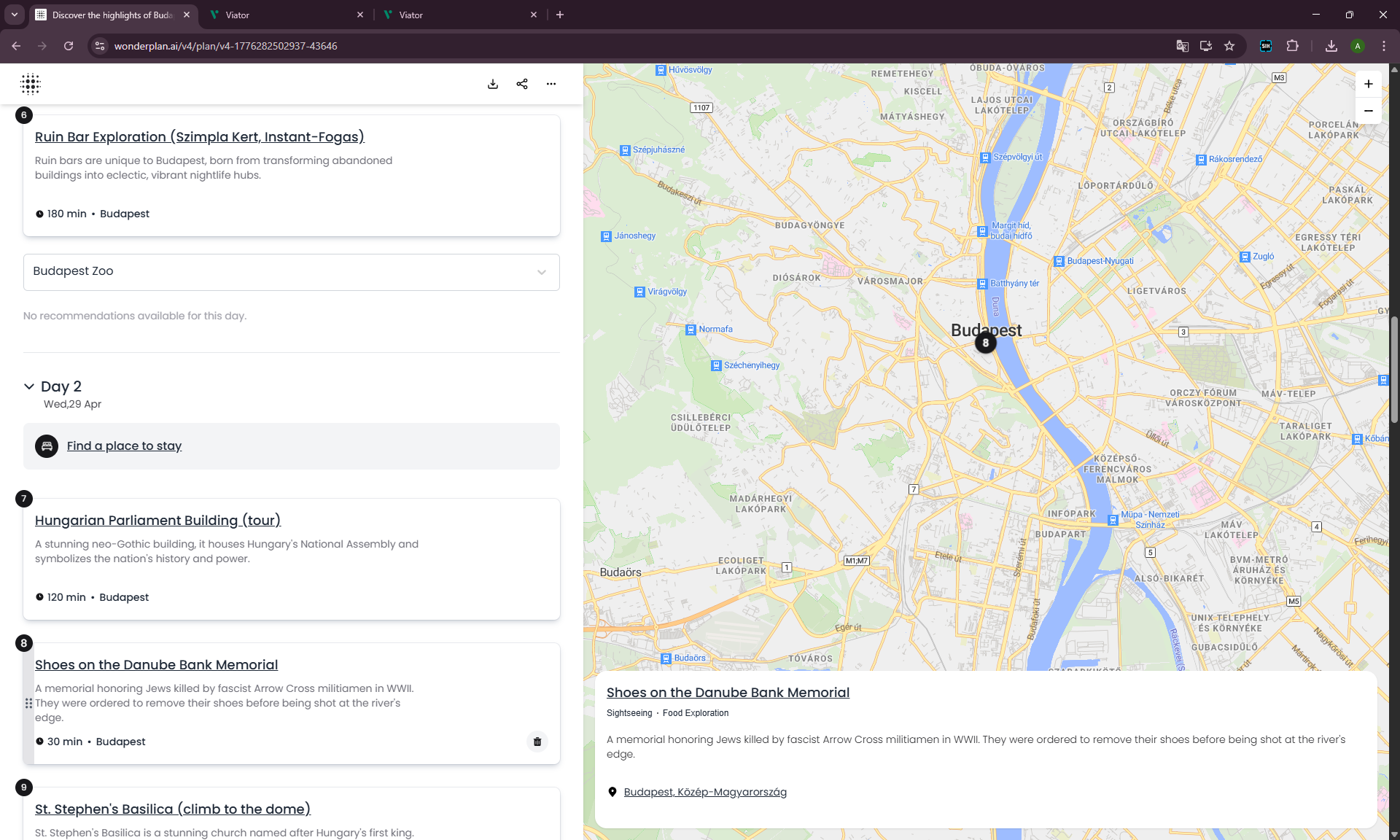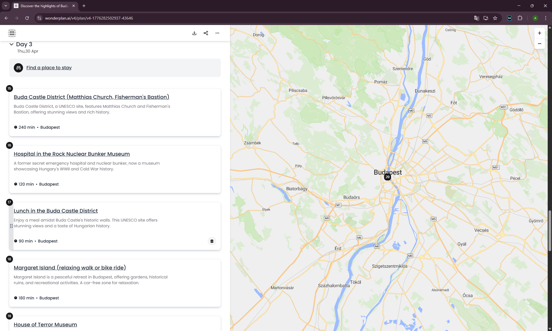 11 stops in a single day. For Solo, the algorithm simply increased route density and added cultural weight — putting House of Terror into Day 1 and a late evening Danube walk into Day 2.