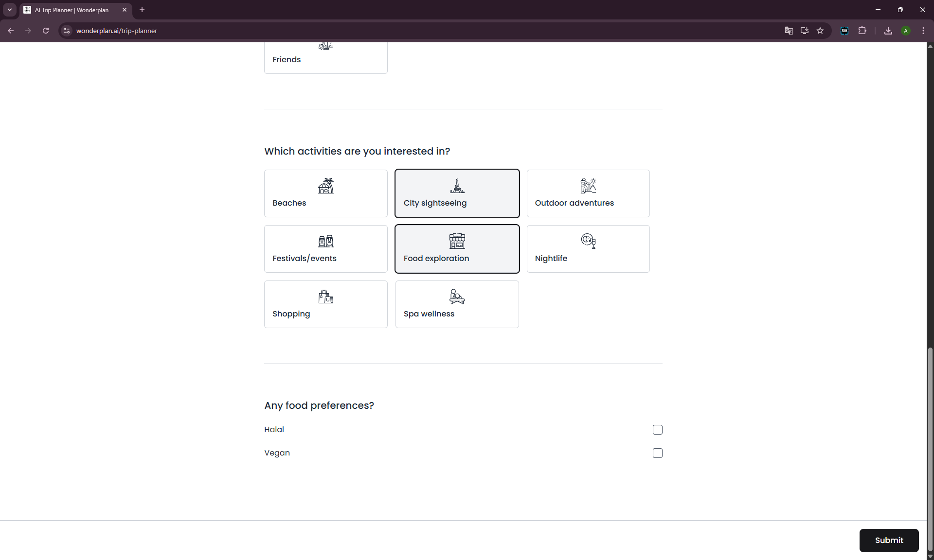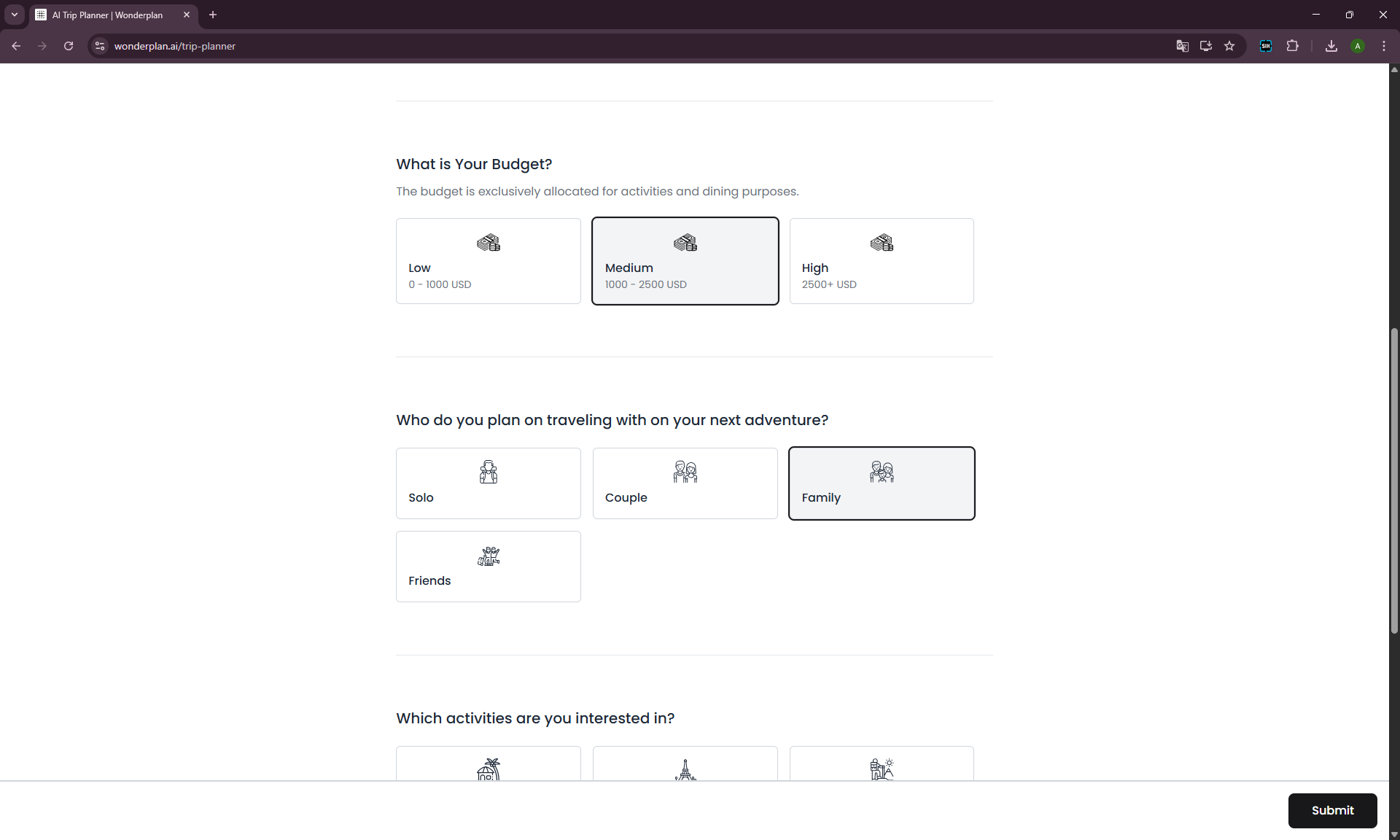 Wonderplan (wonderplan.ai) is a free online itinerary generator. It works through a form: destination, dates, number of days, budget (Low / Medium / High), travel companions (Solo / Couple / Family / Friends), activities, and food preferences.